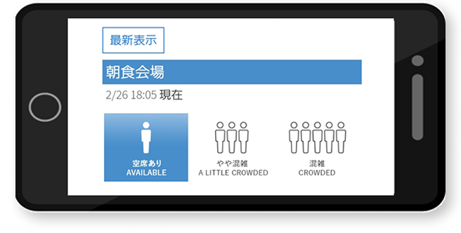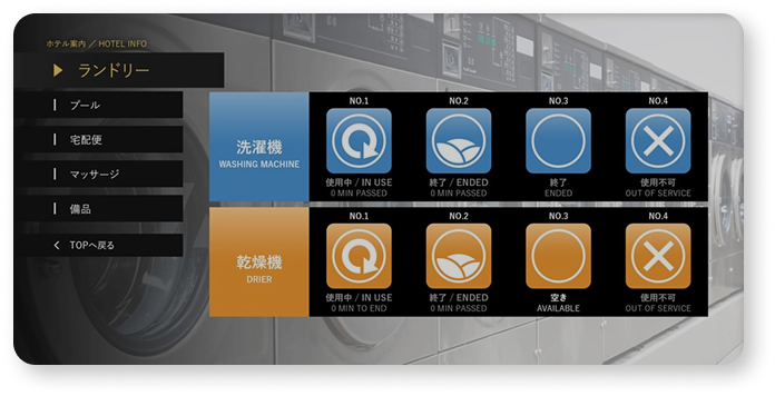 レストランや大浴場の混雑状況、ランドリーの使用状況などを客室テレビなどにリアルタイムで表示します。利用者が不満に感じる機会を減らすことや利用者の満足度向上につながります。